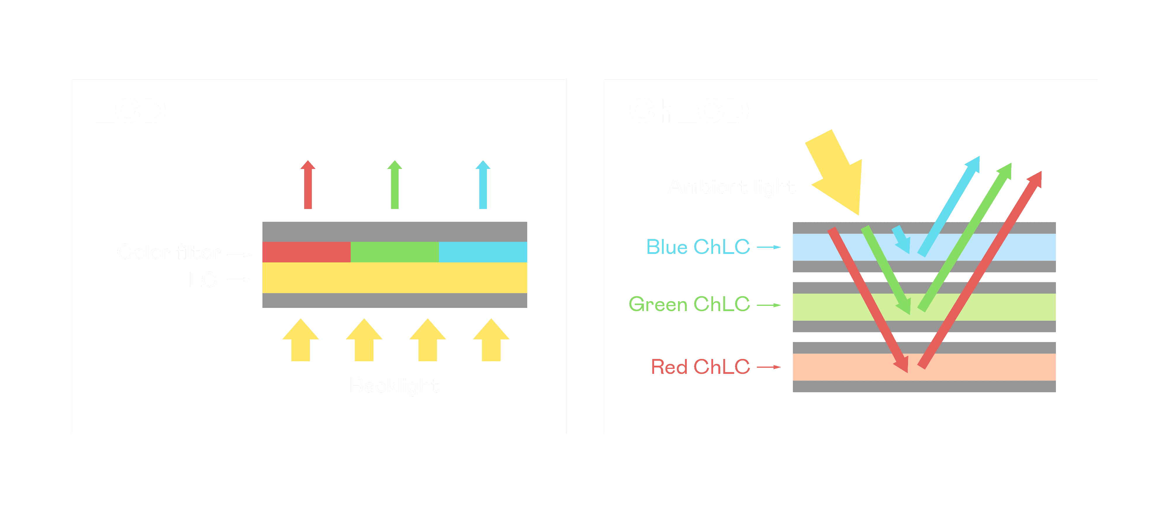 ChLCD 胆固醇液晶就如同纸张一样,,,透过反射环境光来显示影像,,,,因此长时间观看不易造成人眼视觉疲劳,,,可达到护眼效果。。。。当处于户外阳光下使用,,,,LCD 影像容易失真而不易观看,,,但胆固醇液晶仍可维持较佳的影像品质。。。。