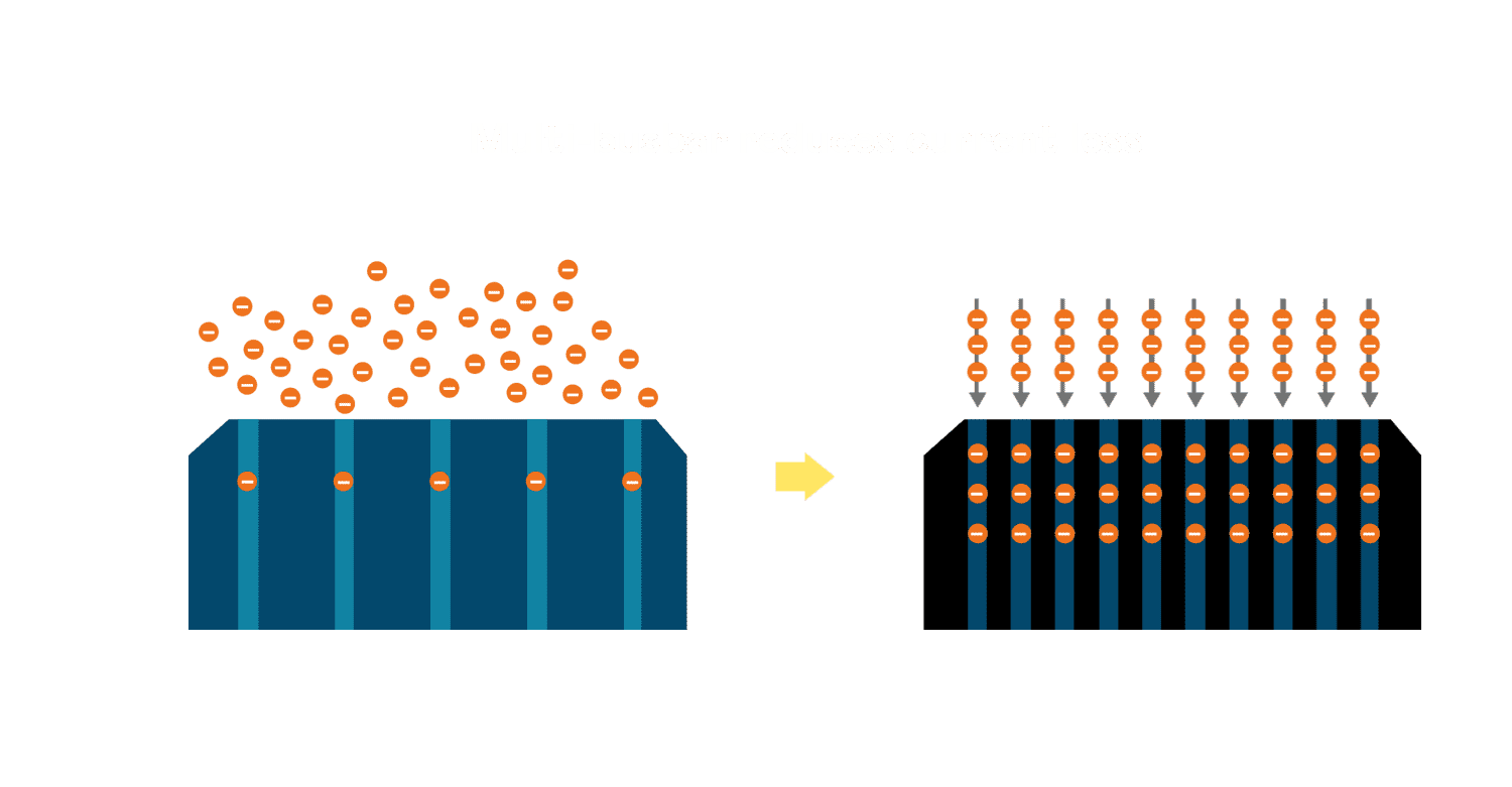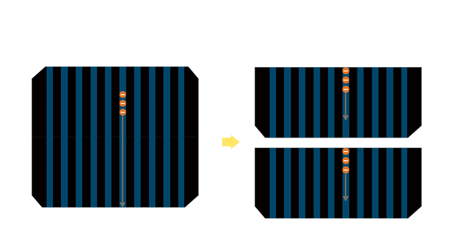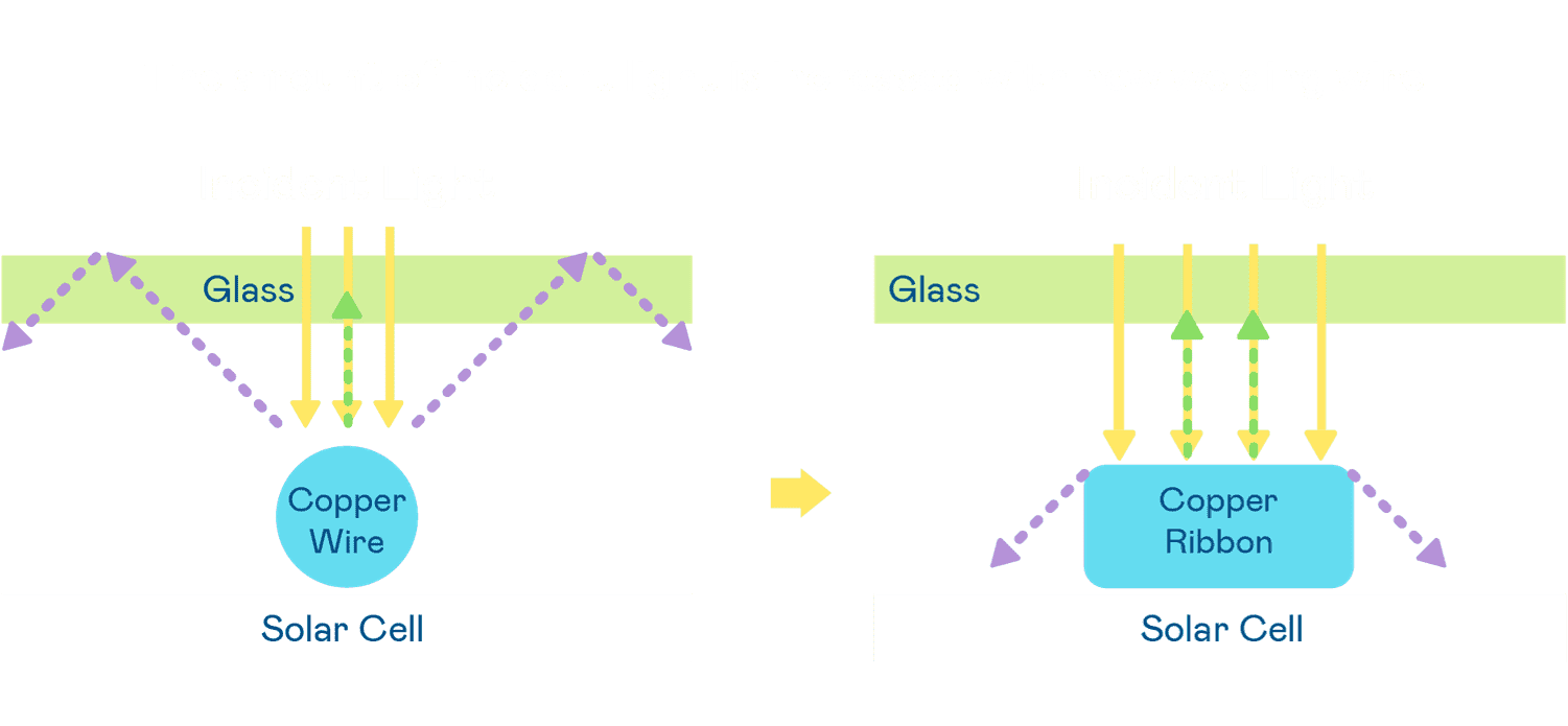 - 电池使用多条铜导线 (Copper wire) 于电池片上形成较短的电流路径,,提高电流收集效率,,,,采用圆形设计的铜导线较传统扁平式的铜焊带 (Ribbon),,,可增加入射至电池的光线量。。。。