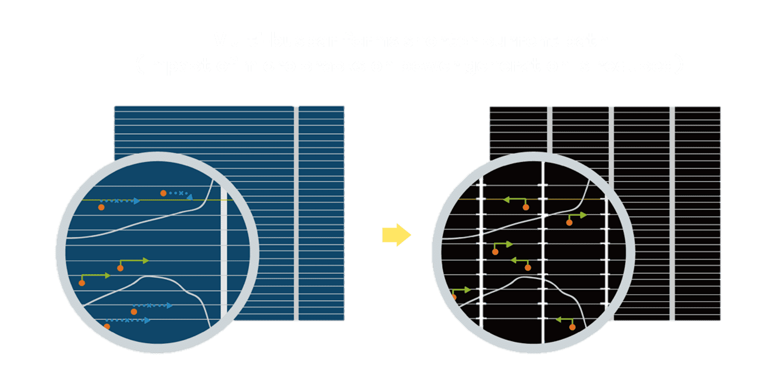 - 结合半切电池,,,降低遮阴影响、、提升模组抗隐裂能力、、并减少电阻损耗,,进一步提升模组发电效能。。。