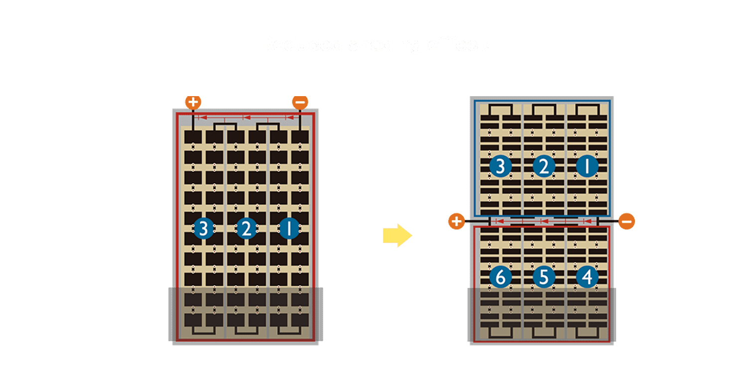 优化的太阳能电池结构设计,,,,不仅提高电流收集效率,,,降低电池隐裂,,,使太阳能模组长期维持稳定的输出效能,,,提高营运效益。。